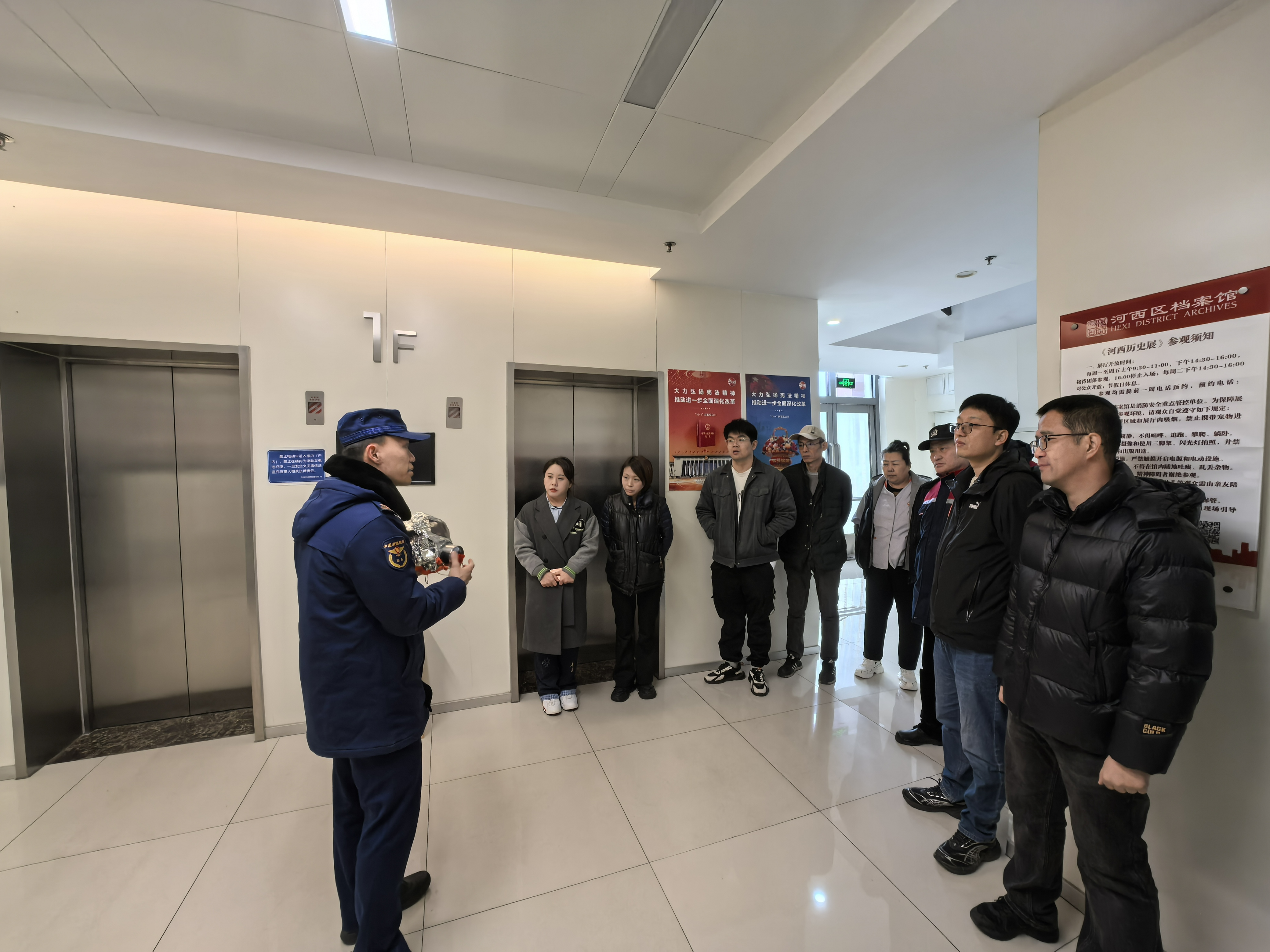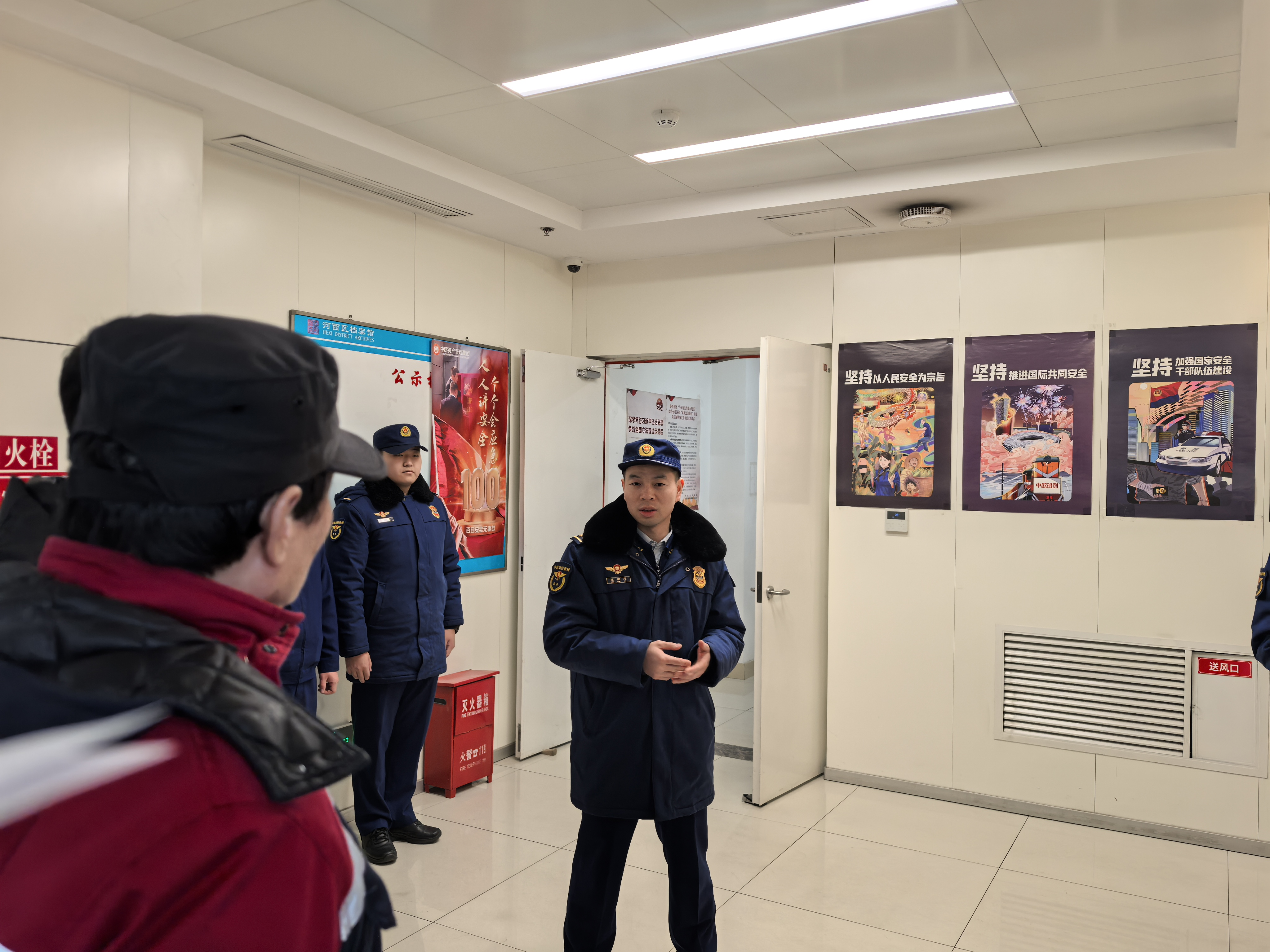 期间,针对消防控制室、微型消防站、消防水箱等重点部位逐一细致筛查,对值班人员的资质和各种登记进行检查指导,确保不放过每一个细节,保证了安全的闭环。对档案馆工作人员和物业公司员工进行消防培训,如何正确逃生、如何灭火、消防栓的使用,灭火器的使用等进行详细讲解。消防官兵带领物业人员进行消防演练,手把手带教,每个动作亲自演示,进一步提升我馆消防水平和消防意识,确保“两会”期间安全稳定。